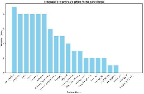 For feature selection, we used a random forest model to assess the feature importance based on reductions in Gini impurity. Given the variability among participants, we retained features exceeding the median importance score individually for each person, allowing the personalized refinement of the model to emphasize predictors critical for predictive accuracy in specific contexts. Figure 2 shows the distribution of feature utilization. Additionally, we imputed missing values in the dataset using a random forest model. Finally, we normalized the input features before training.