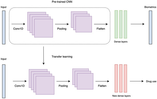 The supervised learning framework used a pre-trained model for multi-output regression on biometric data and transfer learning for drug use classification, as depicted in Figure 3. In the pre-training phase, the model utilized identical hyperparameters to the supervised CNN to maintain consistency. It processed selected features from each participant using a Conv1D layer for feature extraction, a pooling layer to reduce dimensions, and a flatten layer that transforms feature maps into vectors. We then passed these vectors through dense layers and used mean squared error for biometric predictions. Subsequently, we used the weights from the convolutional, pooling, and flatten layers for fine-tuning. We augmented this backbone with new dense layers specifically designed for the binary classification of drug use and fine-tuned the model to this new task. Additions included a dense layer with 32 units and ReLU activation, a dropout layer with a 50% rate to mitigate overfitting, and a final dense layer with sigmoid activation for binary output. The fine-tuning phase similarly used the Brier score for optimization.