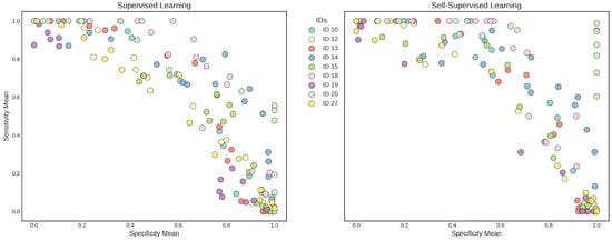 Figure 4 illustrates the trade-offs between the mean sensitivity and specificity across different thresholds for participants 14 and 18, as detailed in Table 6. We specifically chose these participants for this analysis due to their higher AUC values and the stability of their performance metrics across various thresholds. When selecting thresholds, our strategy prioritized achieving high specificity while ensuring reasonable sensitivity, typically around 0.5, and similarly, high sensitivity while maintaining acceptable specificity levels, based on the training performance. We observe from the table that, for Participant 14, the threshold of 0.31 results in a high sensitivity of 0.969 with a modest specificity of 0.543, which suits scenarios where false negatives are more critical to avoid. Conversely, for Participant 18, a threshold of 0.66 yields a specificity of 0.915 and a sensitivity of 0.516, demonstrating a scenario where reducing false positives is prioritized.