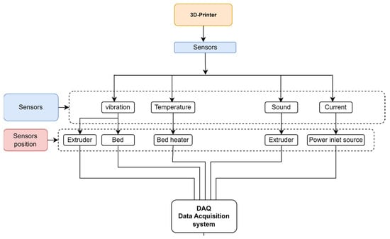 The various types of sensors used are vibration, sound, temperature, and current. Figure 2 and Figure 3 show the overall setup of the data collection from the 3D printer and sensor locations on the 3D printer, respectively. The vibration sensor that has been used here is VBR series—VBR1D03A manufactured by Microdetector company based in Modena, Italy which tracks down the vibrations in a 3-axis inclination. The PT-100 temperature sensor, manufactured by Omega Engineering company located in the USA is used. It is a specialized kind of sensor that belongs to a category known as Resistance Temperature Detectors (RTDs). The sound sensor used is an LM393 sound detection sensor, and the current sensor, the Pico TA301 Current Clamp manufactured by Pico Technology Company located in Cambridgeshire, United Kingdom, is used to measure the incoming current to a 3D printer.