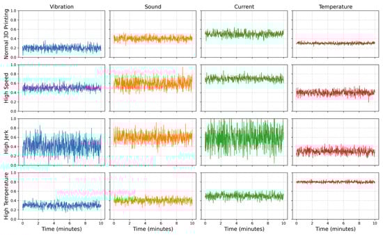Collected normalized vibration, current, temperature, and sound sensor signal representation for different operating conditions.