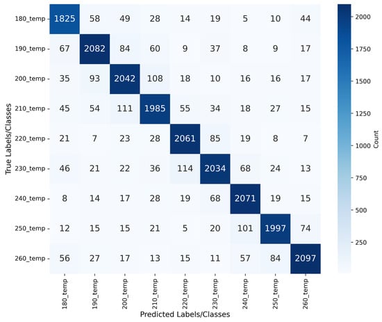 Figure 5 shows the confusion matrix of the RFC model for variable temperature conditions. From the confusion matrix, it is observed that the model is effectively able to classify the different classes based on the variable operating printing temperature.
