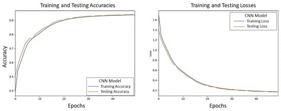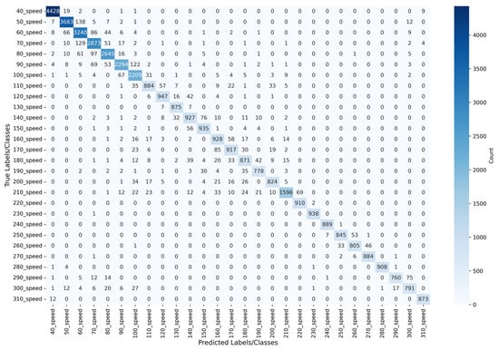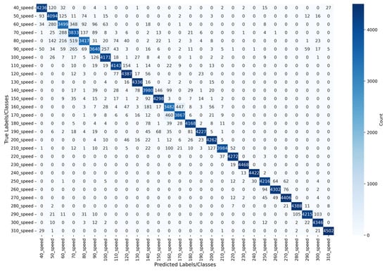 In the CNN model, for the variable speed condition, in Figure 9, learning curves demonstrate how well the model performed on the training set of data. The curve indicates that the model is becoming better by minimizing the misclassification errors between the anticipated and actual speed classes with the loss curve having a consistent downward trend. The accuracy curve is likewise constantly rising, suggesting that the model’s estimates of variable speed classification are improving. These findings imply that the speed model performs well at predicting speed based on input variables and can identify patterns and correlations in the data.