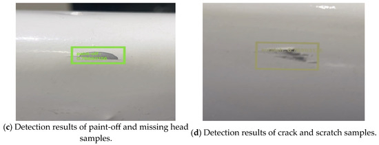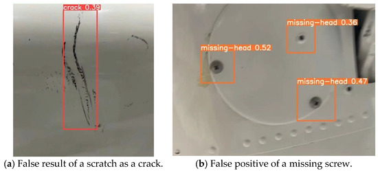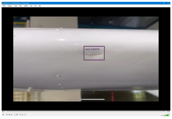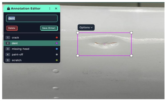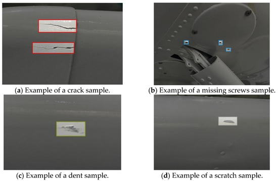 Defects in the images were categorized into classes, resulting in 783 crack samples, 423 dent samples, 918 paint-off samples, 1054 missing rivet samples, 999 scratch samples and 421 null samples. With the tool provided by Roboflow, the images underwent an augmentation process, with features such as shear, which allows the model to observe more potential defect angles; exposure, which decreases the effect of light on the cameras; tile, which allows the model to perform better on smaller objects; and blur, which decreases the effects of camera focus on the model. The exported dataset consisted of 10,029 samples, with a null ratio of 85%. The ratios of the training, validation and testing sets were 70%, 20% and 10%, respectively. The following figure shows an example of the annotated images.