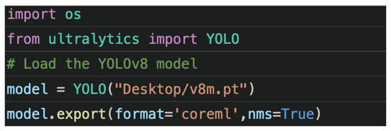 The application developed in this study focused mainly on utilizing the trained model from the training session to detect defects in real-world aircraft. By default, the trained weights are saved in PyTorch format. To make them compatible with an iPhone application, they need to be converted to a format that the iOS can read. Figure 6 shows the code for converting the trained weights to CoreML format [13].