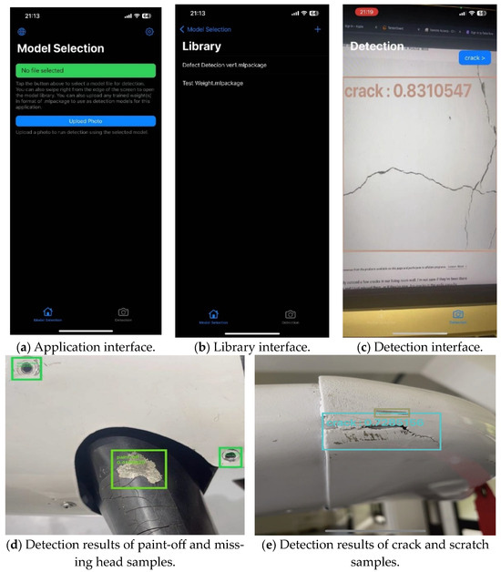 The model selected in the later stage of the experiment was YOLOv9c. Although the YOLOv9 model had the highest FLOPs among the models discussed in Table 3, it outperformed the others, indicating its powerful ability to detect defects as trained and its good adaptation to the prepared dataset. As the main concern of the study was to design a relatively lightweight device for the operator to use during inspection, we compared the performance of two mobile devices, including an iPhone 13 and a Raspberry Pi 4 with camera module 3. Figure 19a–d show a comparison of the devices mentioned. The comparison was intended solely to identify whether and to what extent the camera specifications affected the detection capability of the application on each device. In Figure 19a,c, the detection is performed on the right wing of a Cessna, where two crack samples can be found adjacent to each other on the same surface. As shown in Figure 19a, the iPhone camera could detect the crack on the surface, while in Figure 19c, only the larger crack was recognized by the Pi camera. The same situation also occurred with the other set of data, in Figure 19b, where a small scratch could be found above the crack, but the Pi camera failed to recognize it in Figure 19d.