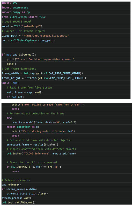 The detections performed by imagery captured from the UAV are relatively indirect, as the identification cannot be performed on the UAV itself. In this study, an application called “DJI Pilot” was used to control the UAV. As a built-in function of the application, it allows the user to stream the imagery captured by UAV cameras in real time. Making use of that, we can utilize a function from the Ultralytics library, which allows the user to run object detection directly on the RTMP live stream. Figure 10 shows the code for the detection process for UAV detection, where the code obtains the imagery input from an RTMP server.