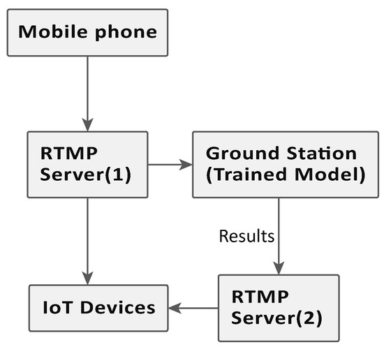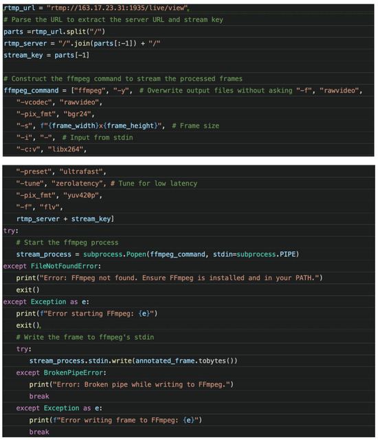 With the code in Figure 10, the result can only be observed on the screen of the ground station computer; therefore, further adjustment is needed to allow reviewing on IoT devices. In this study, ffmpeg was introduced to the code, which captures the results with the “rawvideo” command and upstreams them. Figure 11 shows the other part of the code for upstreaming the results, while Figure 12 features the flowchart of the connection network in this setting.