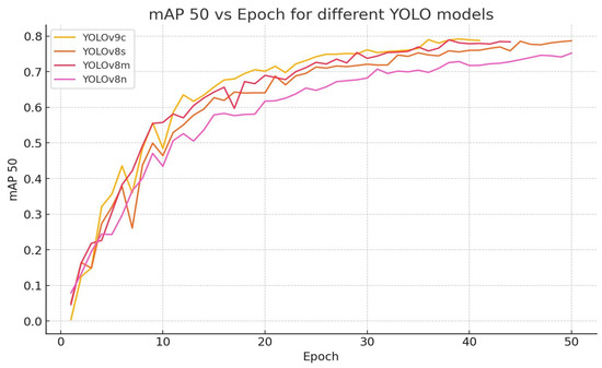 The models underwent a training session using a custom database from Roboflow [7], which included five classes: crack, dent, missing head, paint-off and scratch. The following graphs demonstrate the performance of various YOLO models tested under this environment for 100 epochs, with a batch size of 16 and early stopping patience set to 5 to halt training when no further improvement is achieved. The optimizer was set to “auto”, applying default hyperparameters, such as learning rate = 0.01, momentum = 0.9, weight decay = 0.0001 and optimizer = “SGD”.