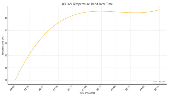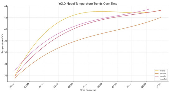 As shown in Figure 21, YOLOv9c exhibited the highest rate of temperature increase, while YOLOv8 Nano, the model with the smallest FLOPs, had the lowest rate of temperature increase. Although YOLOv8 Nano showed the lowest rate of temperature rise, all models reached a high temperature after approximately 10 min of operation. This is concerning, as the device’s endurance only lasts about 10 min, regardless of the computational resources used.