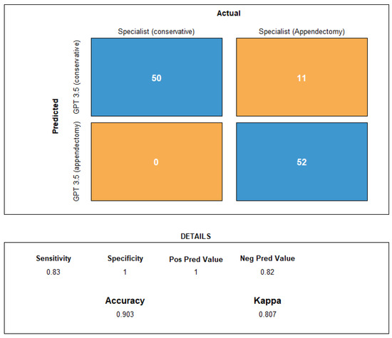 There was an agreement between the reference standard (expert decision—appendicitis confirmed by histopathology) and GPT-3.5 in 102 of 113 cases (accuracy 90.3%; 95% CI: 83.2, 95.0), with an inter-observer Cohen’s kappa of 0.81 (CI: 0.70, 0.91).