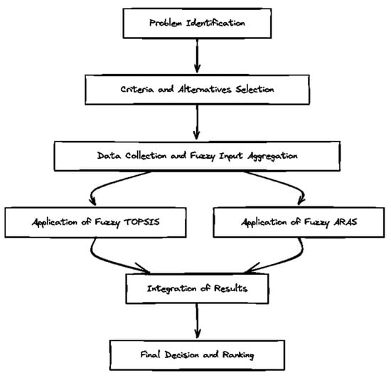 In the proposed hybrid model, the closeness coefficients obtained from the fuzzy TOPSIS and the utility degrees from the fuzzy ARAS are normalized using min-max normalization (Equations (38) and (39)), while the Geometric mean is used to combine the results (Equation (40)). The alternative with the highest hybrid score is indicated as the most preferred.