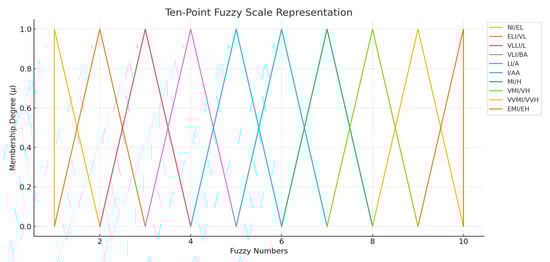The classification of fuzzy importance values in this study was based on a ten-point fuzzy linguistic scale widely referenced in previous fuzzy multi-criteria decision-making (MCDM) studies [26]. The linguistic variables used, such as “Not Important”, “Very Important”, and “Extremely Important”, were mapped to corresponding triangular fuzzy numbers (TFNs). These mappings followed a standardized approach, ensuring consistency and comparability with the existing literature. Thresholds for importance values were determined using established benchmarks from previous studies [27], where each linguistic term corresponded to a specific range within a triangular fuzzy number set. For instance, “Not Important” (NI) was mapped to (1, 1, 2), while “Extremely Important” (EMI) was represented as (9, 10, 10). This standardized approach allowed for the systematic conversion of qualitative expert opinions into quantitative fuzzy numbers.