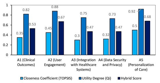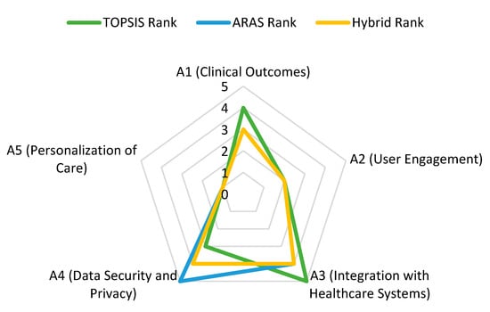 The ranking of A1 (clinical outcomes) in third place suggests that while achieving positive clinical outcomes remains a central goal of AI-driven mental health solutions, it is often viewed as an outcome that emerges indirectly from other critical factors, such as user engagement and personalization. Experts acknowledged that successful clinical outcomes are closely linked to high levels of user engagement and tailored care experiences, highlighting the interconnected nature of these criteria. This explains why clinical outcomes, despite their significance, were slightly deprioritized compared to the more immediate impact of user-centered factors. A4 (data security and privacy) ranked fourth, indicating that while data protection measures are foundational to successfully deploying AI-driven health solutions, they are often perceived as baseline requirements rather than differentiating factors. Experts viewed compliance with security standards and privacy protocols as essential but insufficient on their own to drive user adoption or improve therapeutic outcomes. Similarly, A3 (integration with healthcare systems) ranked fifth, reflecting its role as a critical but secondary enabler in the overall success of AI-driven mental health interventions. Integration with existing healthcare infrastructure, including interoperability with electronic health records (EHRs), was seen as technically vital but less impactful in influencing immediate user-centered outcomes. The combined model thus reconciles differences between TOPSIS and ARAS, affirming personalization, engagement, and clinical outcomes as priorities while acknowledging the supporting roles of data security and integration.