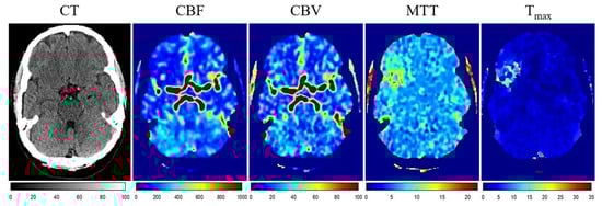 Standard imaging modalities for stroke diagnosis include computed tomography (CT) and magnetic resonance imaging (MRI). CT is the primary modality for stroke imaging because it can provide information-rich images of the brain quickly and at a lower cost, making it widely available in areas with high population density. It can also exclude intracranial hemorrhages and other pathologies that mimic a stroke, such as tumors [2]. CT perfusion imaging is also carried out to quantify and precisely detect brain perfusion. Perfusion deficit can be detected immediately after a stroke, i.e., at the time when standard CT is still negative for stroke [2]. Quantitative perfusion maps, such as cerebral blood flow (CBF), cerebral blood volume (CBV), mean transit time (MTT), and time to peak (Tmax), are used to detect the ischemic region.