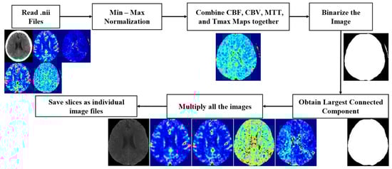 Two main preprocessing tasks involved were skull stripping and image normalization. For skull stripping, the perfusion maps are summed together and binarized. The binarized image contains extraneous regions, which are removed by connected component analysis. Any holes in the final mask are filled using morphological filling. The mask is multiplied by individual image sequences to obtain the final skull-stripped image. All data were normalized using min-max normalization in the range [0–255]. Figure 2 shows the pipeline for skull stripping.