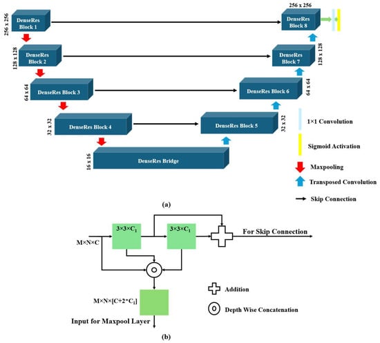 Figure 3 illustrates the proposed network architecture. The proposed architecture draws inspiration from the conventional U-Net [19] framework and dense and residual connections. The proposed architecture consists of four downsampling and four upsampling layers. Each layer incorporates a DenseRes block. There are two convolutional blocks in each DenseRes block. The convolutional blocks contain the convolutional layers, leaky ReLU as an activation function, and instance normalization. The outputs of two convolutional layers are concatenated with the input. This serves as the input to the subsequent layers after passing through a layer of maxpooling. Maxpooling is signified by the red arrow, and transposed convolutions can be identified as blue arrows in Figure 3a. Additionally, for the skip connections, the output of each convolutional block is summed with the residual connections, which serve as the input to the decoder. Figure 3b shows the internal architecture of the DenseRes block. C1 represents the number of convolutional filters, and C represents the depth of the input feature for each DenseRes block. The total number of trainable parameters in the proposed model is 21 M. Table 1 shows the number of convolution filters and strides in each DenseRes block.