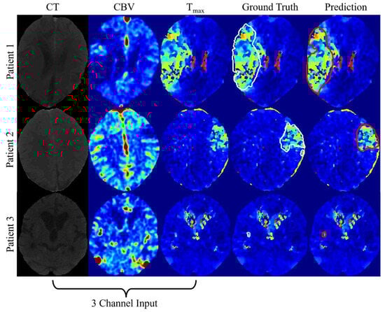 Illustrates the predictions generated by the proposed DenseResU-NetCTPSS. The first column represents the CT images, the second column shows the CBV maps, and the third column shows the Tmax maps. CT perfusion maps are shown in pseudo-color to correspond to the quantitative nature of the maps. The fourth and fifth columns show the ground truth (white contour) and prediction (red contour) overlaid on the Tmax maps.