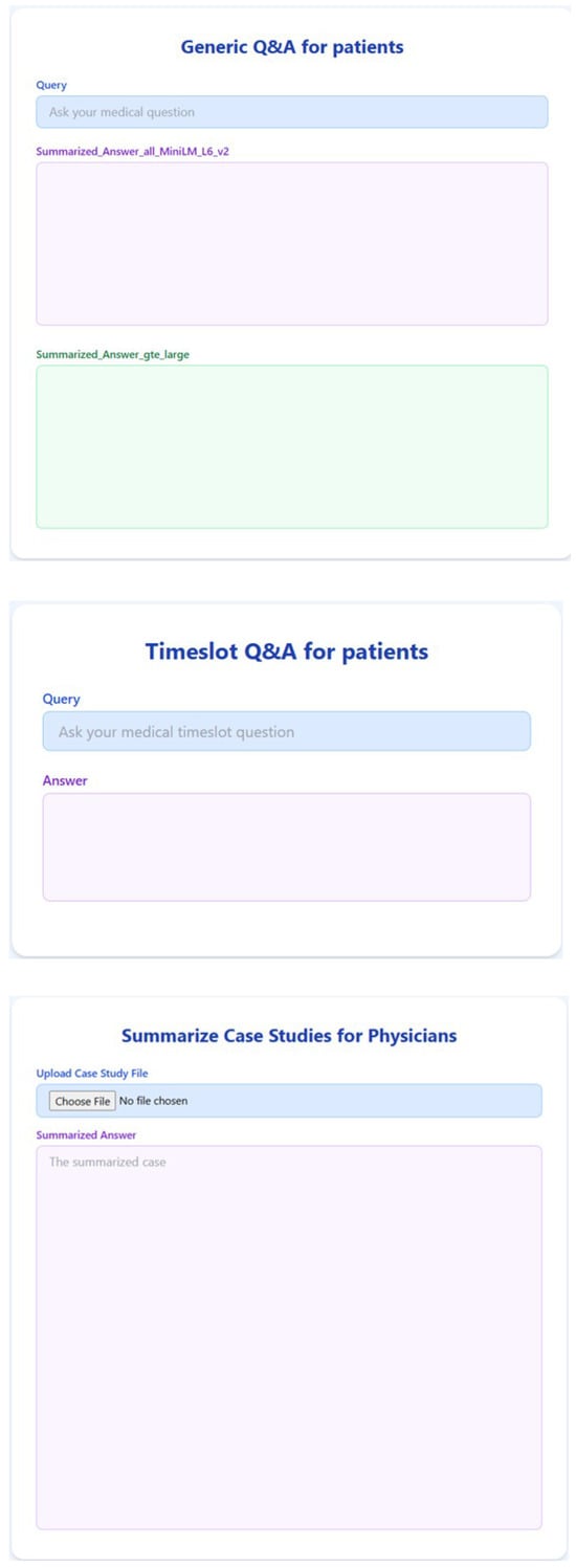 The End-User Mode represents the operational phase of the system, where patients or clinicians interact with the RAG-based medical AI assistant through a conversational interface. As shown in Figure 3, this mode supports multiple functionalities tailored to the workflows of both patients and clinicians. It supports three primary query types, each designed to address a specific aspect of the clinical or administrative workflow.