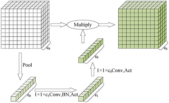 Squeeze and excitation, proposed in [43], introduces a lightweight attention mechanism into CNNs. It enhances the feature extraction ability for certain features by adjusting the weights of different channels while suppressing irrelevant features, thus improving the network’s performance. The SE block can directly replace network modules or be inserted into existing networks. It only requires a small number of operations to enhance network performance with a minimal increase in parameters and computational load compared to the original network. As shown in Figure 1, the SE structure consists of two parts: ‘squeeze’ and ‘excitation’. The ‘squeeze’ structure compresses the feature map through global pooling, while the ‘excitation’ structure extracts global features using two fully connected layers and a nonlinear function to form channel weights, which are then applied to the input feature map to implement attention on different features.