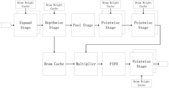 The last step of the SE module’s computation involves multiplying the input feature map data stored in BRAM with the results of the pointwise convolutions. The output timing of this operation differs from other convolution modules’ input timings. Since the final stage of the accelerator is a pointwise convolutional module, and like other pointwise convolutional modules in the accelerator, this module also requires two stages for data reading and computation, the output rate of the squeeze-and-excite module must be synchronized with the input rate of the downstream pointwise convolutional module. Therefore, a FIFO buffer is placed at the end of the SE module, and the control is achieved using the FIFO’s empty and full signals.