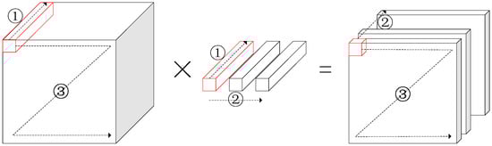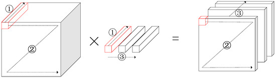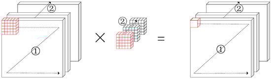 The pointwise convolution module at the beginning of the accelerator differs from the other pointwise convolution modules and is referred to as the expand module. As the first stage of the pipeline, the expand module reads data from AXI DMA ip core. To match its output data flow with the downstream depthwise module, the multiplication window is moved over the input feature map in the order of input channels–width–height–output channels. The computation flow of this module is illustrated in Algorithm 1 and Figure 3, where and represent the data at position in the i-th input feature map channel and the n-th output feature map channel, respectively, and denotes the weight of the i-th channel in the n-th convolution kernel.