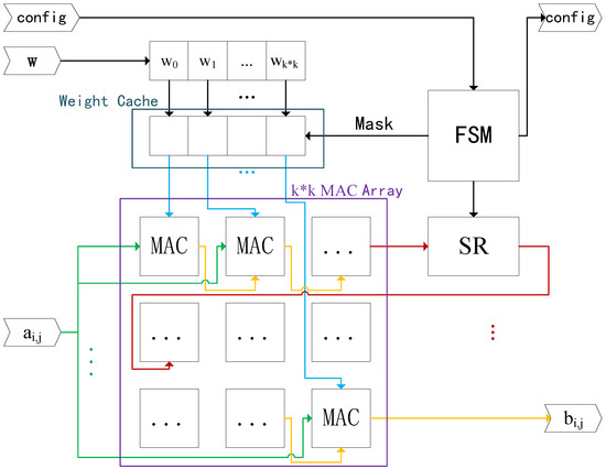 The 2D convolution adopts a sliding window calculation with the structure shown in Figure 5. It consists of a multiplier-accumulator (MAC) array, shift registers (SRs), and a flow controller. The MAC array and SR together form a pipeline that can be accessed independently at each level. At the input of the multipliers, all MACs in the array use the same input feature map data . The MAC at position in the array uses , so each computation cycle combines the input feature map data from to with the weight data. The MAC outputs in each row, except for the last one, are connected to the next MAC’s summation input. The output of the last MAC in the row is connected to the SR, and the SR’s output is connected to the first MAC of the next row. The final output of the MAC at position is the output of this module. By combining different product terms, the 2D convolution result can be obtained.