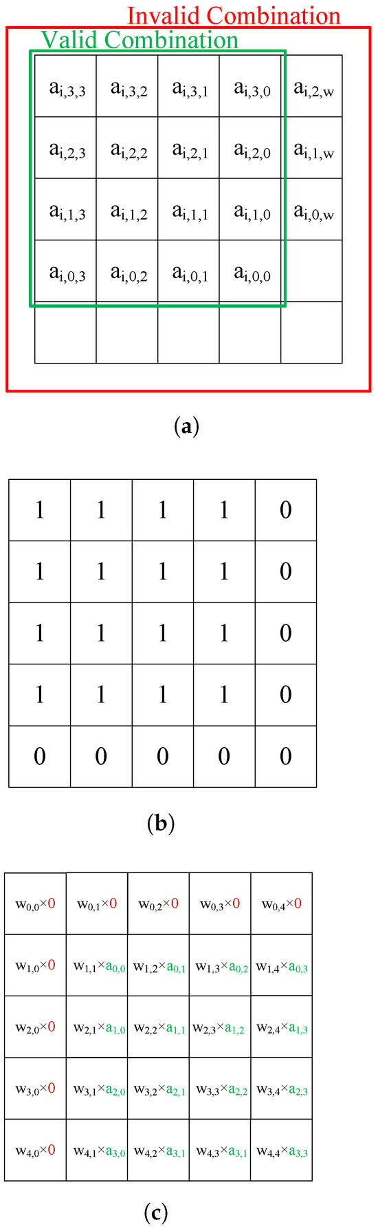 (a) Output of the MAC array; (b) mask required to obtain valid result; (c) convolution with padding.