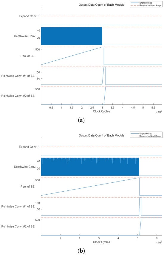 The experiment was conducted using the last bottleneck module from MobileNetV3-Small with the module parameters shown in Table 1. A pipeline system simulation was performed for the overall accelerator. Each time a module finishes a computation, the output count is incremented. When the output data of the current stage are enough for the next stage to perform a computation, the output count is decremented by the required data amount. This helps to track whether there is any data backlog in each module. The results are shown in Figure 8, where Figure 8a shows the simulation result for non-parallel computation, and Figure 8b shows the simulation result for a parallelism configuration of 48-288-72-288. As can be seen, even when the parallelism is increased to unreasonable values, the temporary data generated by each module are still processed in time without any data congestion.