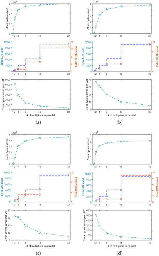This section presents the experimental results on the impact of stacking 1, 2, 4, 8, 16, and 32 multipliers in the four parallelizable modules of the accelerator. The experiments examine the effect of these configurations on the overall computation speed and resource consumption. To clearly showcase the performance and resource consumption of different module configurations, Figure 9 compares the reduction in computation time and the increase in resource consumption relative to the non-parallel case.