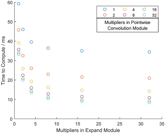 Analysis of the experimental outcomes reveals that as the parallelism of each module increases, the gains in computation time decrease rapidly. Since the parallelism is set to powers of two, increasing the parallelism causes the LUT resource consumption to double. As parallelism increases, the BRAM used to cache the weight data also needs to read multiple data points at once, which increases the data bit-width accordingly. Additionally, the available capacity of BRAM is also affected by the bit width, resulting in a sharp increase in usage when a certain level of parallelism is reached. Figure 10 illustrates the trend of computation speed improvement as different parallelism levels are set for the expand module and pointwise convolution module. The SE module mentioned in the figure has a much smaller computational load because its input feature map has a width and height of , which results in faster computation. However, the gains in computation time from increasing parallelism are much smaller compared to the expand module and pointwise module. Nevertheless, the LUT and BRAM resource consumption in the SE module is comparable to that of the expand module and pointwise convolution module. The impact on performance is much smaller in the SE module, which is why the parallelism of the two pointwise convolutions in the SE module is set to 1. From the figure, it can be observed that as parallelism increases from 16 to 32, the computation time savings become minimal, while BRAM consumption increases by , , , and , respectively. This marginal effect is better reflected in the time savings per LUT.
