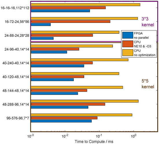 This section compares the performance of the FPGA accelerator and the ARM Cortex A9 CPU in the same chip as well as other solutions from the existing literature. The CPU clock frequency of the ZYNQ 7020 is set to 666.67 MHz, and the FPGA clock frequency is set to 100 MHz. The same bottleneck module as shown in Table 1 is used for comparison. Figure 11 shows the time required to perform the same computation on the MobileNet V3-small using the CPU and FPGA implementations. The labels on the left indicate the number of input channels, the number of channels after the expand module, the number of output channels, and the width and height of the input feature map. Although there are several optimization techniques available on the ARM CPU, such as utilizing the NE10 library to exploit the ARM NEON instruction set for SIMD (single instruction multiple data) operations, the FPGA accelerator, even without additional stacked multipliers, is able to outperform the pure CPU solution. Among the listed computation modules, the speedup can range from 1.47× to 54×.