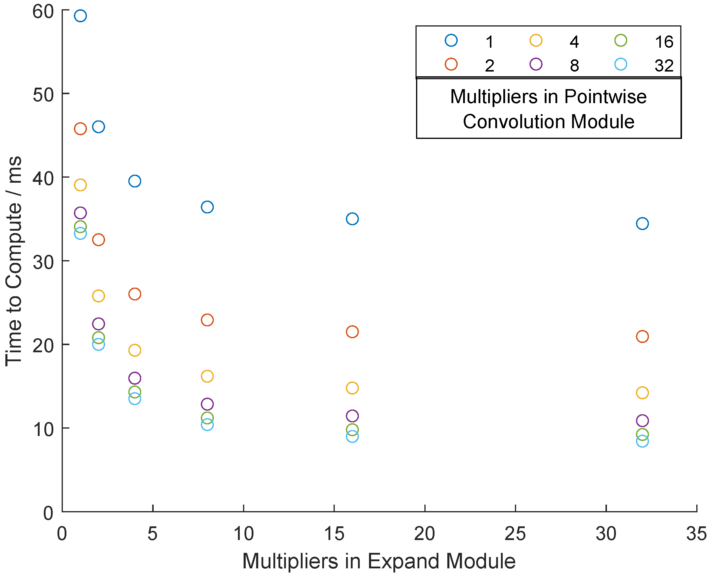 - The impact of parallel computing on resource consumption and computing speed is analyzed in detail, and a strategy of adjusting parallelism according to actual needs is proposed to achieve a balance between computing speed and resource consumption. The expand module and pointwise convolution module in the accelerator can be implemented in parallel by stacking multipliers, which improves the computational efficiency.