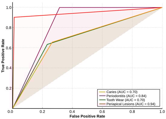 The AI system showed excellent sensitivity for periodontitis (1.00; AUC = 0.84), aligning with previous findings that AI models can effectively identify radiographic signs of periodontal bone loss. However, a notable proportion of false positives (32.4%) was recorded, often due to overestimation of periodontal involvement by the AI. This observation underscores the importance of supervised interpretation, especially in populations with low disease prevalence or in cases where radiographic artifacts and anatomical variability may mimic pathology. For caries detection, the AI system yielded acceptable sensitivity (0.74; AUC = 0.69), comparable to previous studies using panoramic radiographs and AI, although slightly below thresholds typically seen with bitewing-based models. The system’s performance for tooth wear was more modest (sensitivity = 0.53; AUC = 0.68), likely reflecting the limitations of panoramic imaging in capturing occlusal and incisal wear facets, and the multifactorial nature of tooth wear patterns in athletes.
