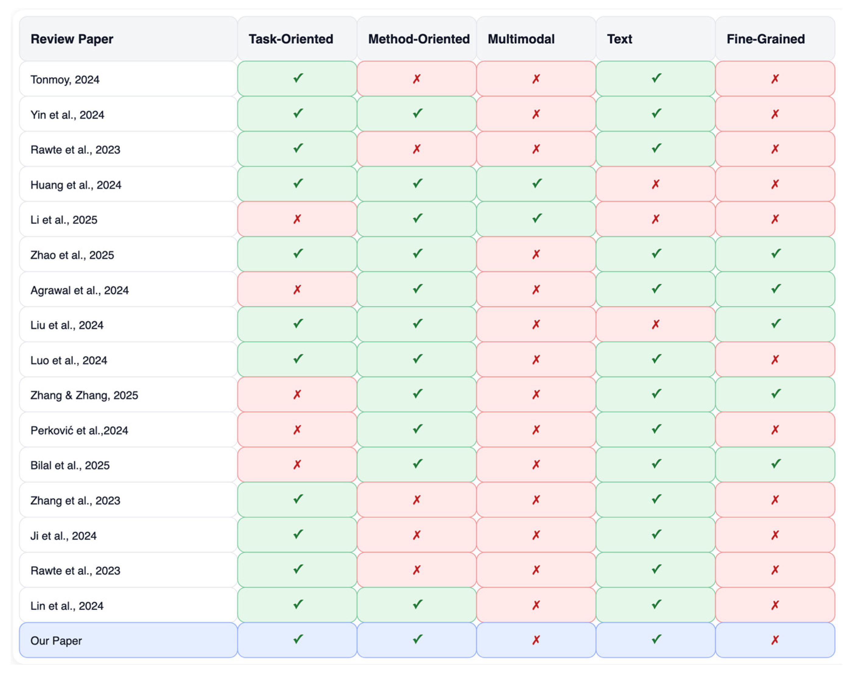 - Paper-level tagging, where every study was assigned one or more tags corresponding to its employed mitigation strategies. Our review accounts for papers that propose multiple methodologies by assigning them multiple tags, ensuring a comprehensive representation of each paper’s contributions.