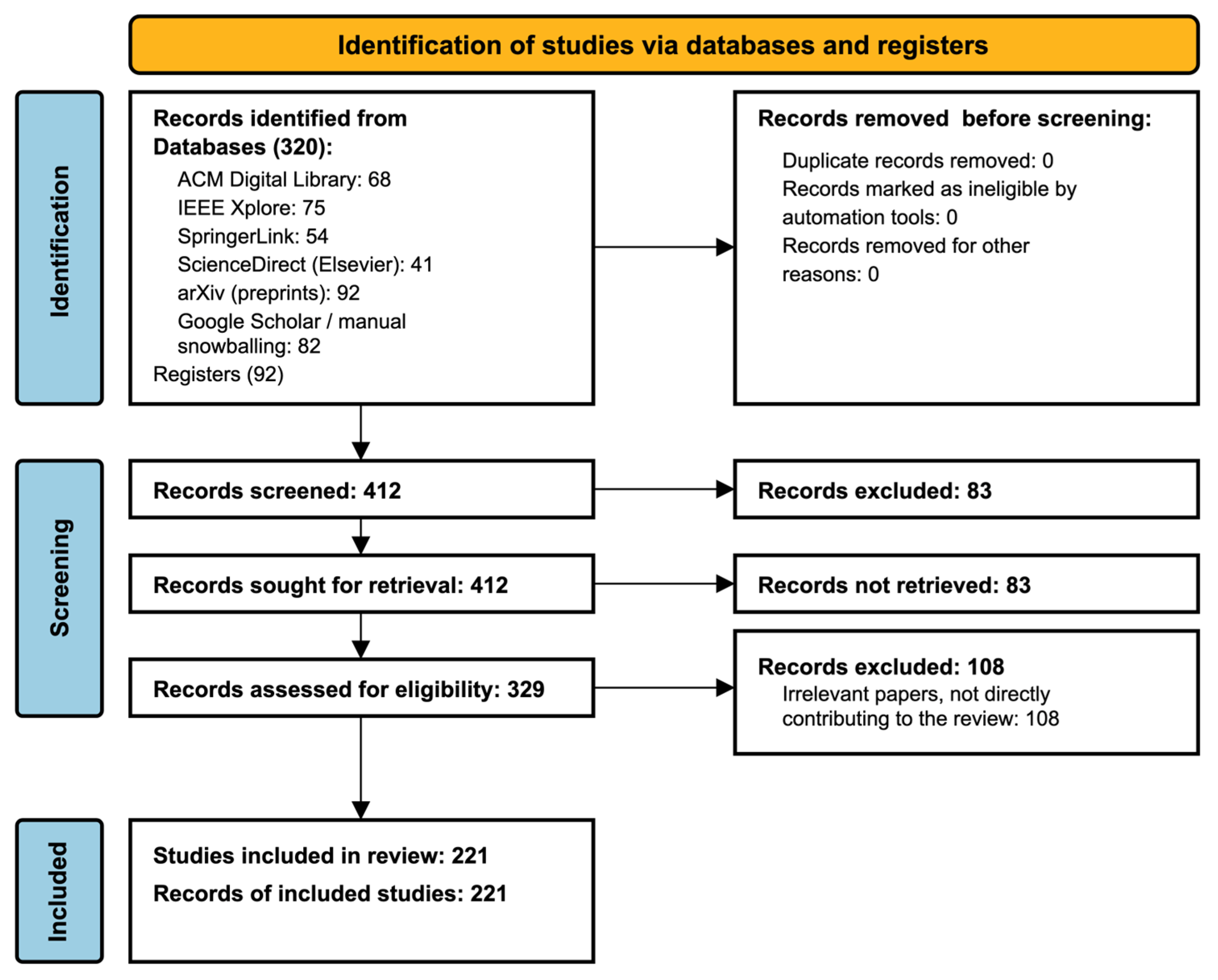 - Screening: The screening process followed a two-stage approach. First, titles and abstracts were screened for topical relevance. Records passing this stage underwent a full-text review to assess eligibility. Out of 412 initially retrieved records, 83 were excluded as irrelevant at the screening stage. The 329 eligible papers were then examined in detail and further categorized into support studies, literature reviews, datasets/benchmarks, and works directly proposing hallucination detection or mitigation methods. The final set of 221 studies formed the basis of our taxonomy. This process is summarized in Figure 2.