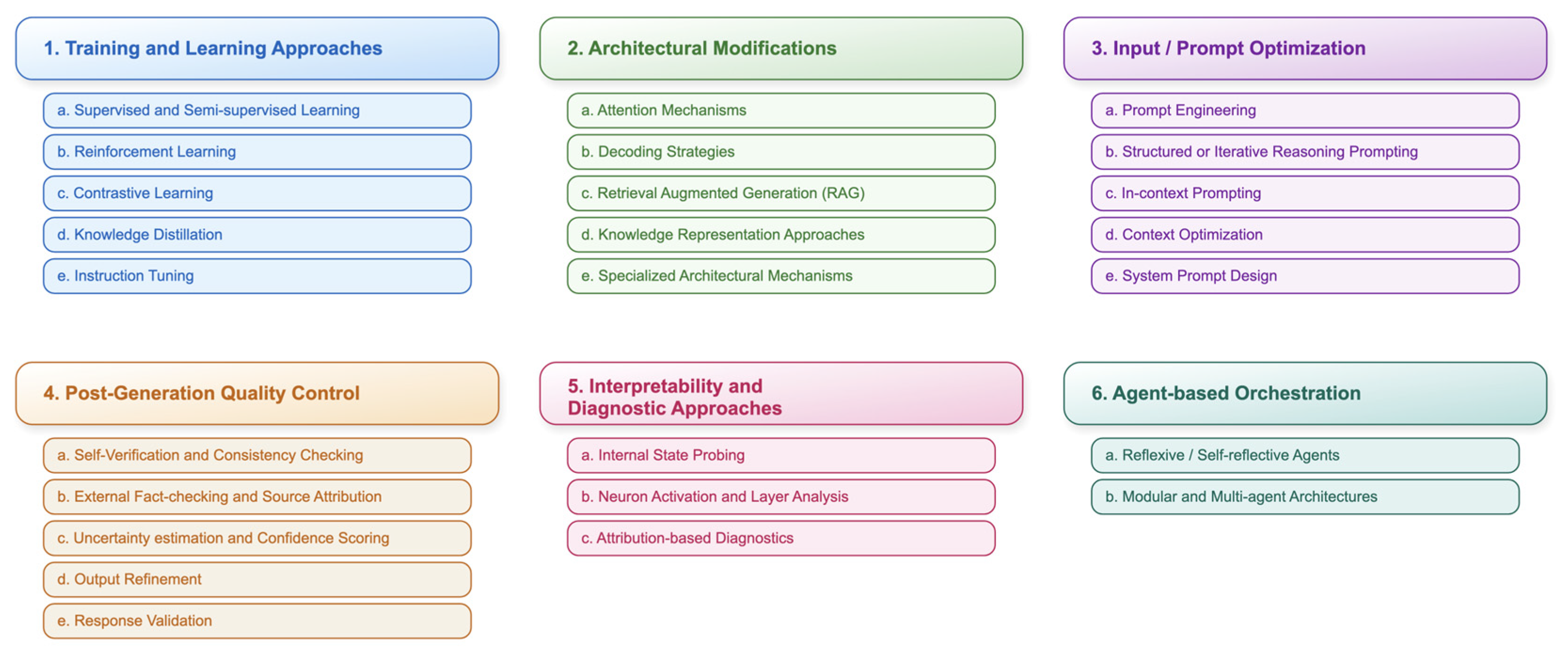 - Input/Prompt Optimization (Section 5.3): Focuses on strategies for crafting and refining the text provided to AI models to steer their behavior and output, often specifically to mitigate hallucinations.