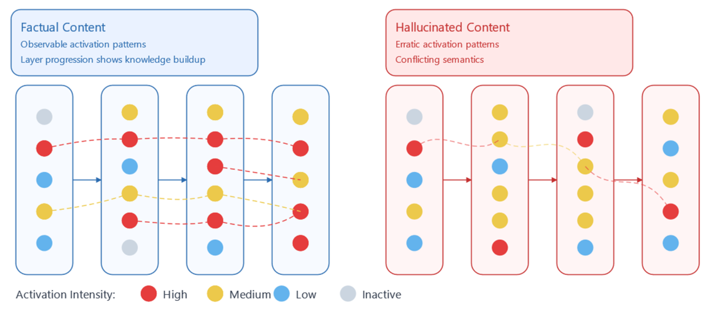 - Internal Representation Intervention and Layer Analysis: Understanding how LLMs encode replies in their early internal states is key to developing decoding strategies that mitigate hallucinations [30]. Hallucination-prone outputs often display diffuse activation patterns rather than concentrated on relevant references. In-context sharpness metrics address this by enforcing sharper token activations, ensuring predictions emerge from high-confidence knowledge areas [184]. Inference-Time Intervention (ITI) shifts activations until the response is complete [185], while DoLa contrasts logits from early and later layers, emphasizing factual knowledge embedded in deeper layers over less reliable lower-layer signals [150]. Activation Decoding similarly constrains token probabilities using entropy-derived activations without retraining [184]. LayerSkip introduces self-speculative decoding, training models with layer dropout and early-exit loss so that earlier layer predictions are verified by later ones, thereby improving efficiency [186].