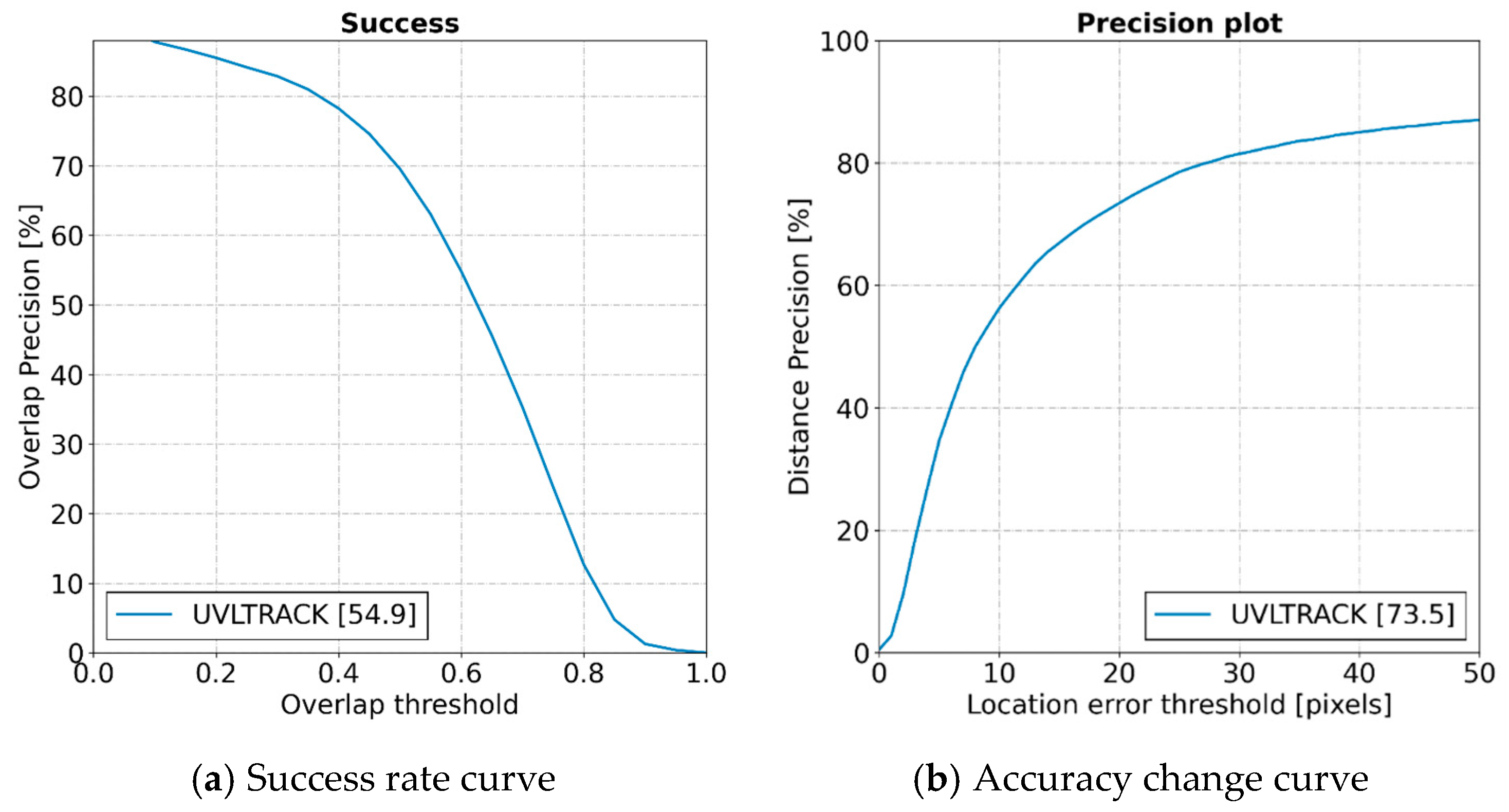 Figure 5a shows the success rate curve generated by calculating the Intersection-over-Union (IoU) between predicted and ground-truth bounding boxes across various overlap thresholds.