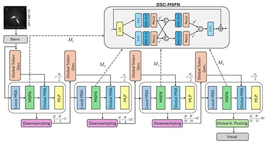 Each architecture stage combines local self-attention for capturing fine-grained features and global self-attention using global tokens. The DSC-MSFN replaces standard MLPs to extract spatial features at multiple scales, and downsampling modules reduce dimensionality while preserving necessary information. The final global pooling aggregates features for classification.