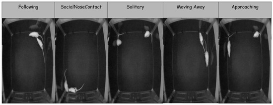Example frames from the RatSI dataset illustrating the five annotated behaviors: Following, Social Nose Contact, Solitary, Moving Away, and Approaching. Each frame is extracted from video annotations provided in the dataset. These examples represent the visual appearance of each behavior class used for model training and evaluation.