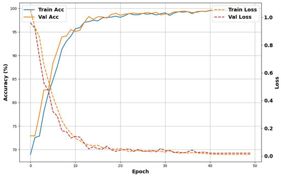 Figure 3 represents the visualization of training and validation accuracy and loss. It shows that the model achieves good results after 10 epochs. However, the model reaches optimal performance at 50 epochs, with maximum training and validation accuracy. The loss decreases to below the 0.5 threshold. This indicates that the model has achieved better convergence over the training period.