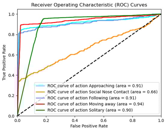Figure 4 shows the ROC curves, together with the corresponding Area Under the Curve (AUC) values, for the five behaviors in our study, as an alternative way to visually evaluate performance. It is easy to see that the model did not perform well on the “Social Nose Contact” behavior. We can also notice that the “Moving Away” behavior has the highest AUC value of 94, even higher than the “Solitary” behavior, which had the best F1 score.