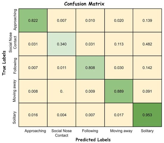 Figure 5 shows the confusion matrix for the best ViT-RSI-B model, which provides insights into how behaviors are misclassified. From the confusion matrix, we observed that only 34% of “Social Nose Contact” frames were correctly classified, while approximately 48% were misclassified as “Solitary”. Smaller portions were also confused with “Moving Away” (11%) and with “Approaching” or “Following” (about 3% each). For example, the “Social Nose Contact” behavior is generally misclassified as “Solitary” behavior, as the rats are probably not moving much when they are close to each other. Therefore, we can infer that misclassifications may occur due to overlapping behaviors and the way the model prioritizes one over another. Some behaviors are misclassified as “Solitary” more often than other behaviors, which suggests that the model might have some bias towards this behavior, thus explaining the good performance observed obtained by the model on the “Solitary” behavior.