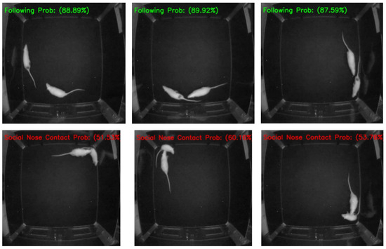 Figure 6 shows example frames from the test video to illustrate the model’s prediction behavior. While the study includes five behavior classes, this figure focuses on two behaviors: “Following” and “Social Nose Contact”. The top row shows correct “Following” predictions, with high confidence. The bottom row includes “Social Nose Contact” predictions, with relatively low confidence, indicating uncertainty or possible misclassification.