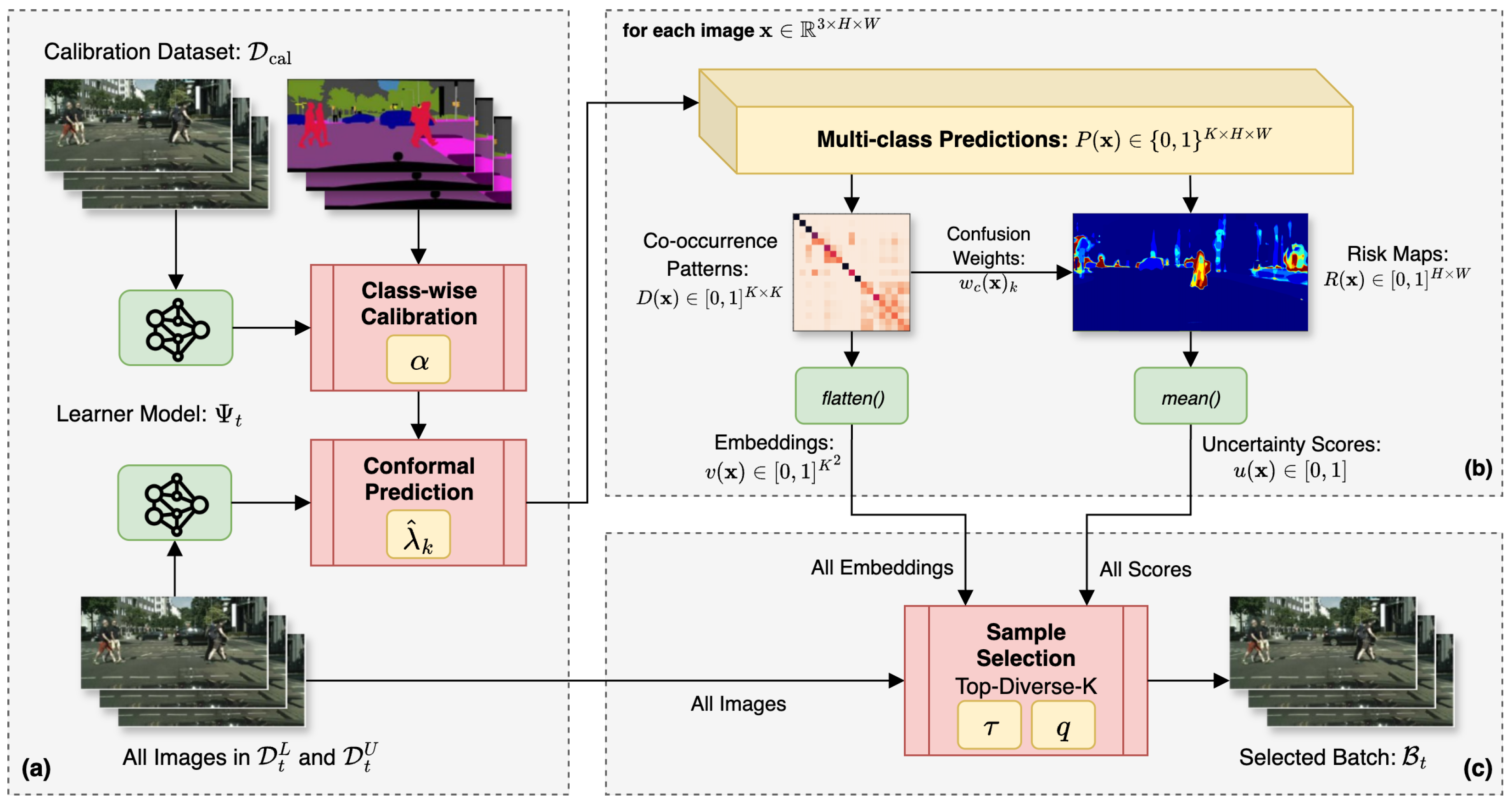 21] have applied conformal prediction to active learning, all focused exclusively on classification tasks. These techniques do not directly translate to the dense, pixel-level setting of semantic segmentation. A critical gap therefore remains: no existing method applies conformal prediction to active learning for semantic segmentation. The dense prediction nature of segmentation introduces unique challenges that classification-focused methods cannot address, including managing complex, interdependent pixel-level outputs and handling severe class imbalance. Our work fills this gap by introducing the first conformal prediction-based active learning framework specifically designed for semantic segmentation.