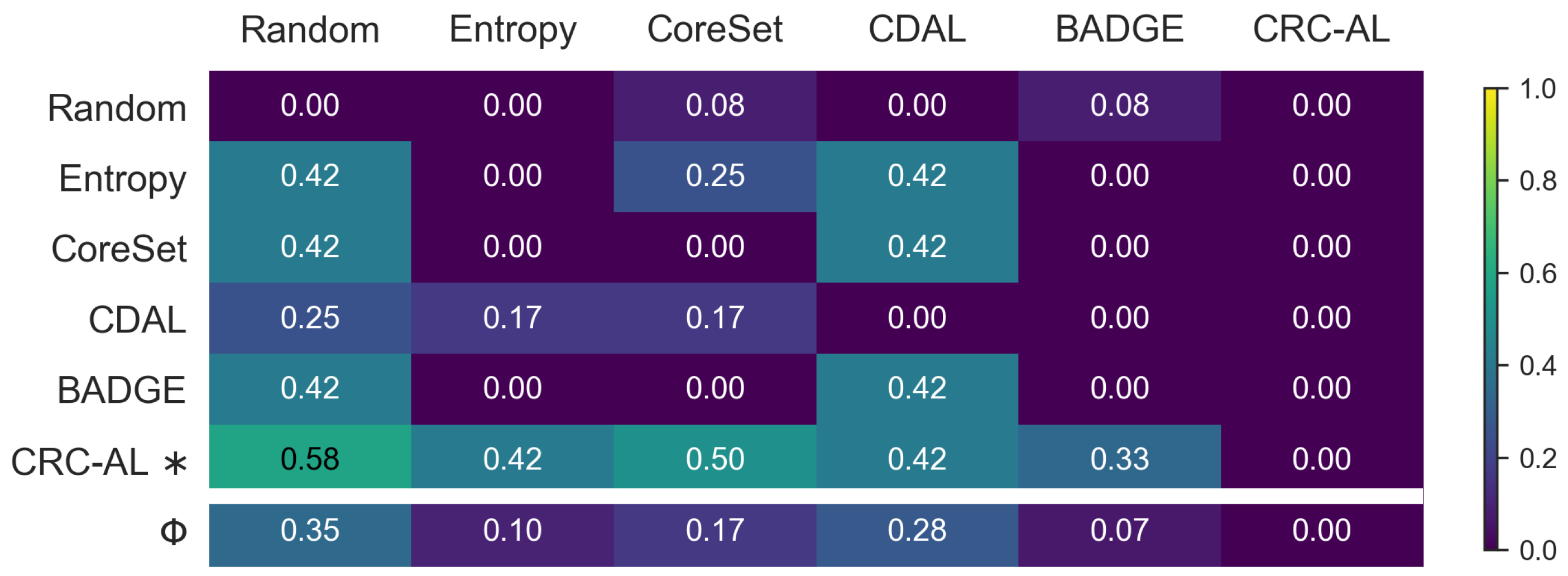Statistical significance: Figure 7 presents the aggregated pairwise penalty matrix (PPM) across two fundamentally different datasets, obtained by element-wise averaging. The diagonal entries are zero by definition, as methods cannot dominate themselves. The CRC-AL row shows that our approach significantly outperforms all competing methods, yielding near-maximum penalties across iterations. The bottom row further confirms CRC-AL’s dominance with