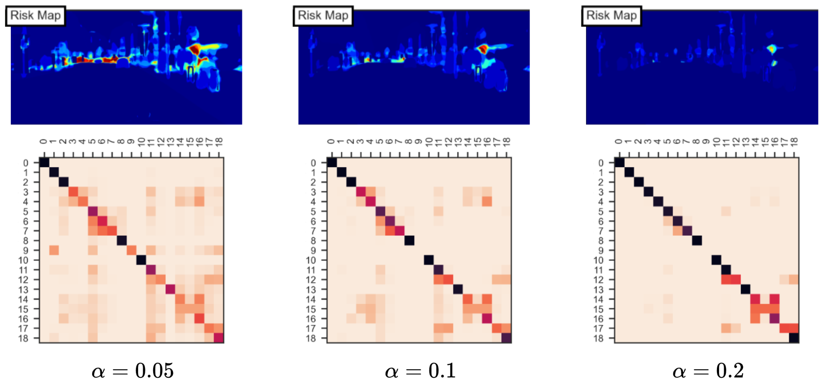 values produce conservative predictions with larger prediction sets. This generates dense risk maps where extensive regions appear uncertain, potentially masking truly informative regions. The resulting embeddings capture spurious co-occurrences that may reflect statistical noise rather than meaningful class confusion patterns.