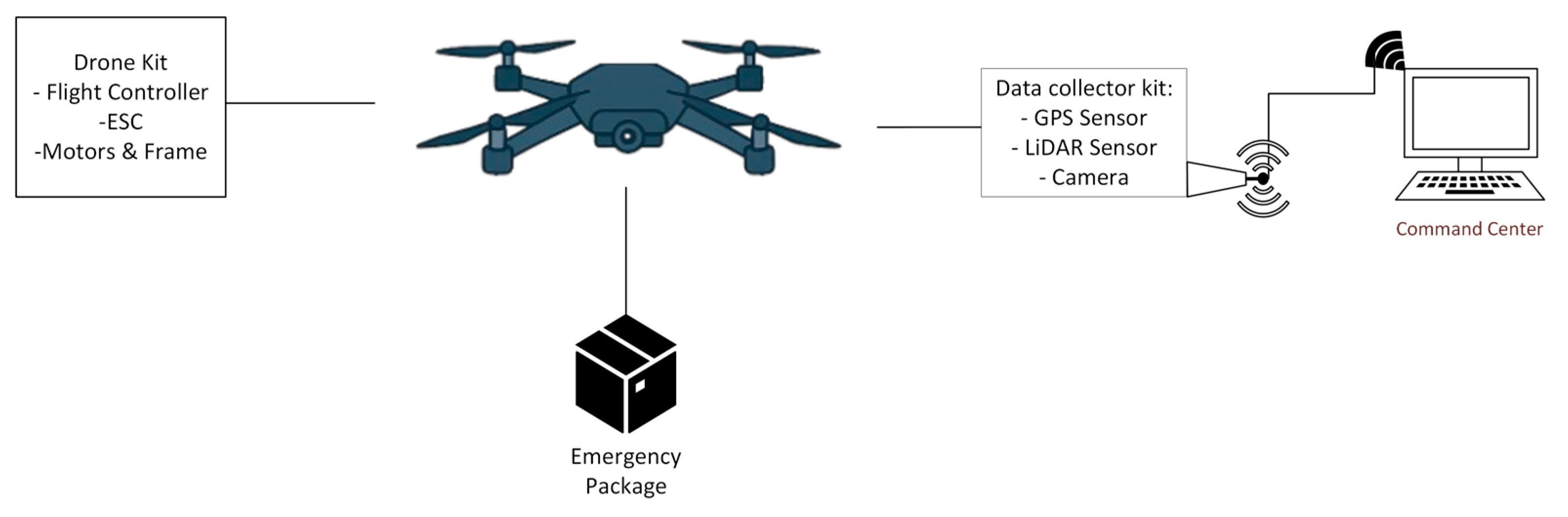 Figure 5, the drone can transport and release controlled first aid packages containing essential items such as medicine, a walkie-talkie for direct communication, a mini-GPS for location tracking, and food rations. With an estimated maximum payload of 300–700 g, this module can transport critical resources. Integrating this module transforms the drone from a passive observation tool into an active system capable of rapidly intervening by delivering critical resources directly to victims in emergency situations.