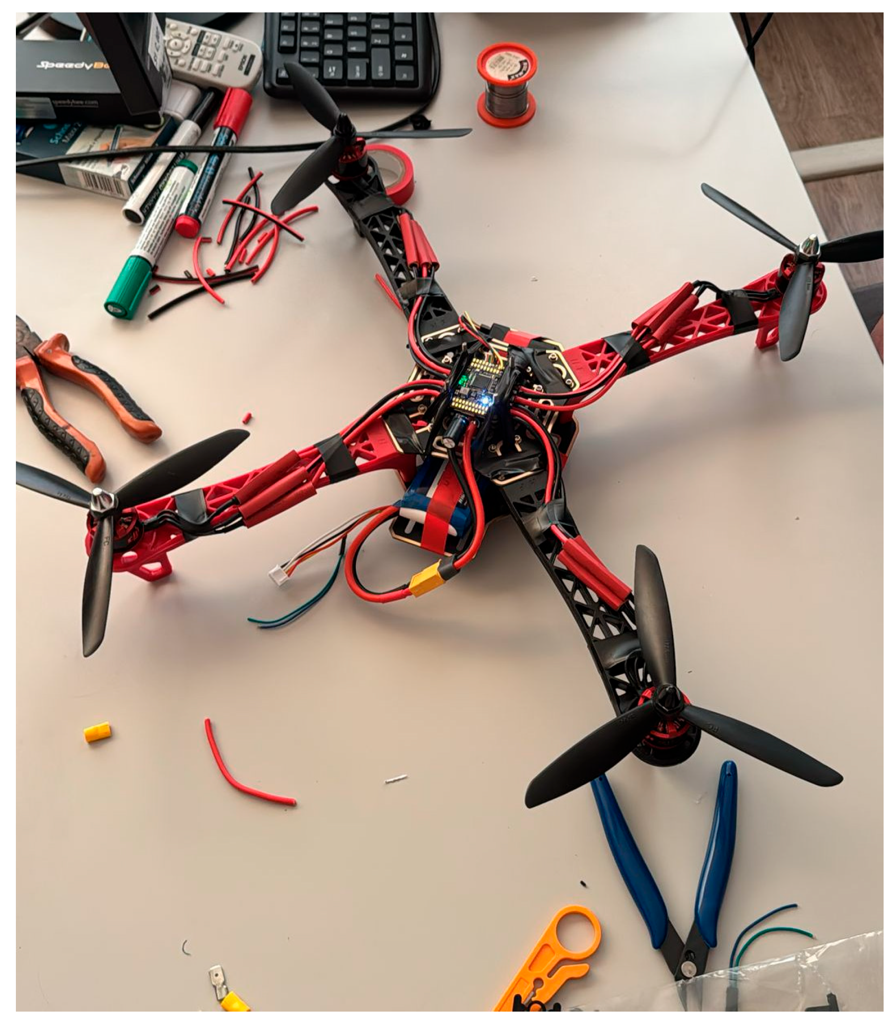 The flight module is the actual aerial platform. It was built and assembled from scratch using an F450 frame and an FPV drone kit. This approach provided detailed control over component selection and assembly, resulting in a modular, adaptable structure. The proposed drone is a multi-motor quadcopter, chosen for its stability during hovering flight and its ability to operate in confined spaces.